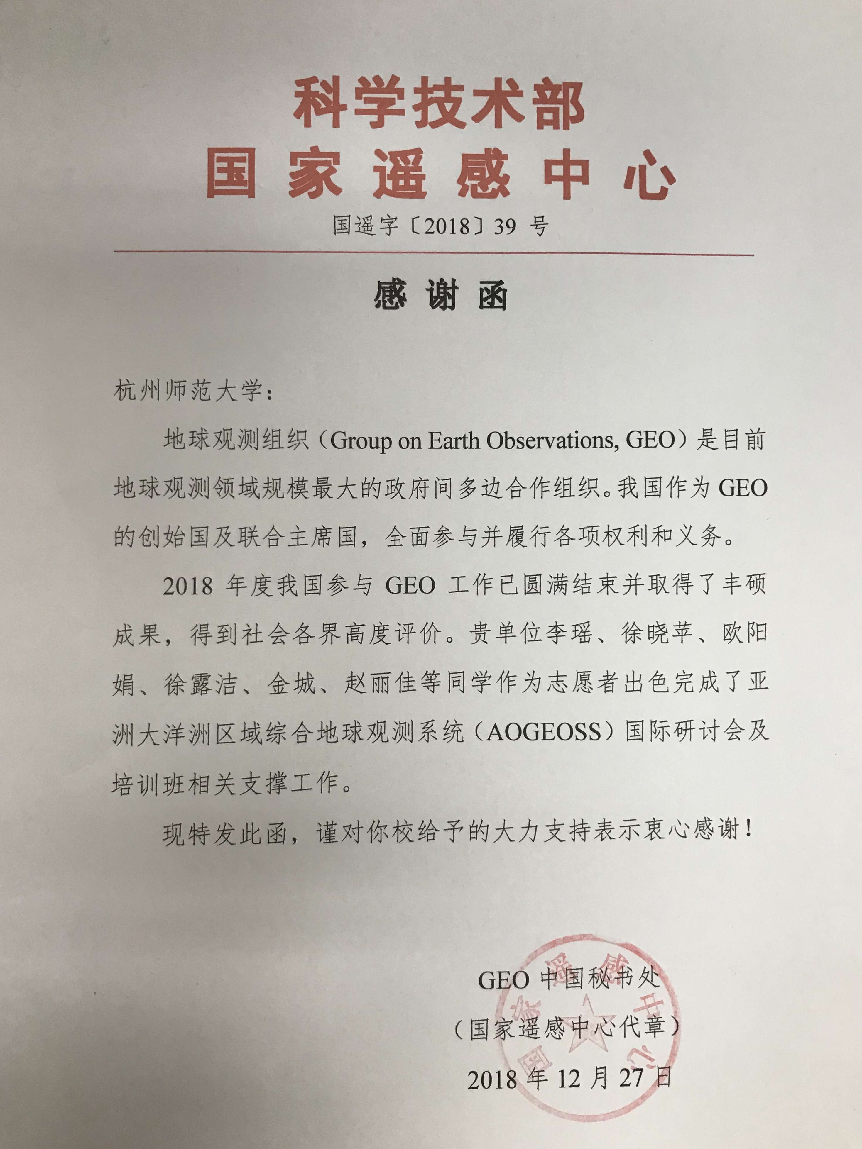 近日,百家乐游戏-百家乐在线游戏收到来自GEO中国秘书处及国家遥感中心的致谢信。亚洲大洋洲区域综合地球观测系统(AOGEOSS)首届国际会议暨AOGEOSS国际培训班于2018年5月16日在浙江德清地理信息小镇开幕。来自中国、日本、澳大利亚、韩国、泰国、印度等16个国家及国际摄影测量与遥感学会等4个国际组织的80余位学者及政府管理人员参加了会议。会议由科技部国家遥感中心(GEO中国秘书处办公室)、地球观测组织(GEO)秘书处主办,其中,我校作为会议协办方对此次国际会议表示大力支持,并由理百家乐游戏 遥感系选派6名志愿者全程协助会议及国际培训等的相关工作,志愿者们细致周到的工作得到了与会人员的一致好评。