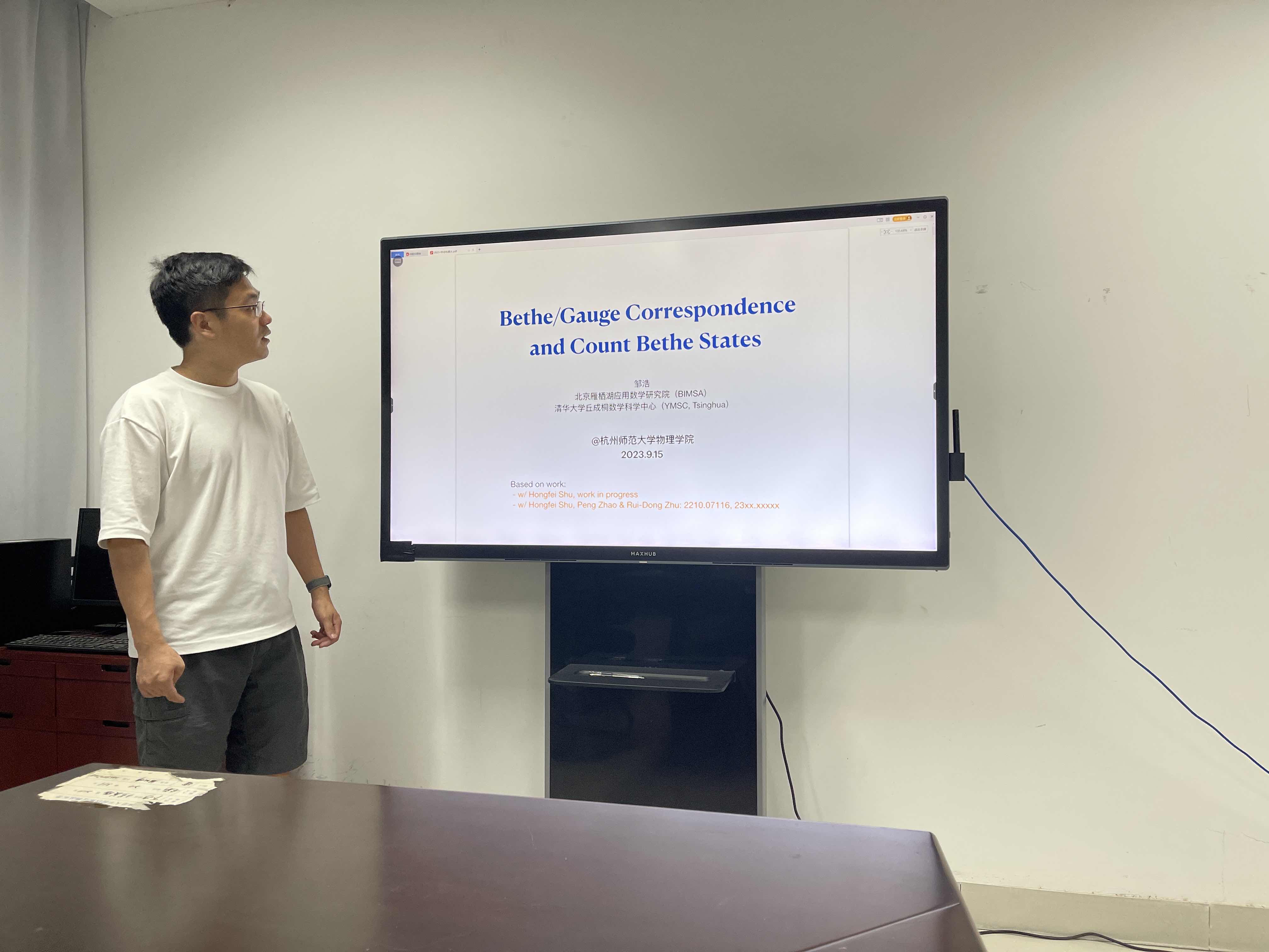 9月15日下午,北京雁栖湖应用数学研究院和清华大学丘成桐数学科学中心的邹浩士博士应邀来百家乐游戏-百家乐在线游戏,为院内师生带来了一场精彩的学术报告。报告的题目是《Bethe/Gauge Correspondence and Count Bethe States》,主要介绍了可积系统里Bethe States的数态问题,Bethe/Gauge Correspondence的对应关系,以及如何把Bethe/Gauge Correspondence应用到超对称规范场论里解决数态问题。
