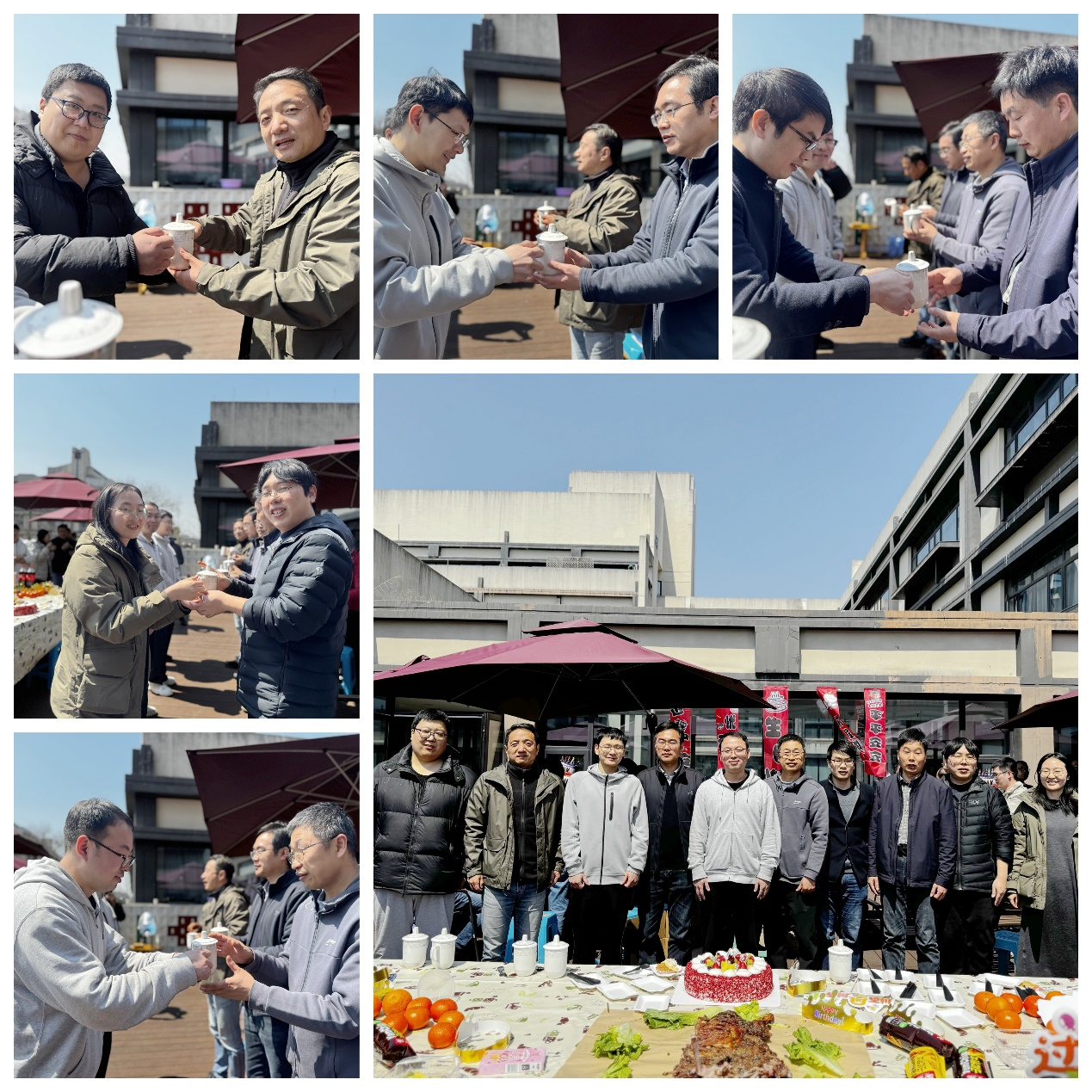 活动现场,鎏金装饰与物理元素交相辉映:"生日快乐"条幅流苏轻扬,恰似优美的波动方程曲线;甜品台上,精心设计的蛋糕以光谱色系层叠晕染,吸引众多目光。寿星教师们沐浴着春日暖阳,在教职工们的注视中定格携手并肩的幸福瞬间。寿星代表还携手切下生日蛋糕,将这份甜蜜与祝福传递给在场的每一位同仁。